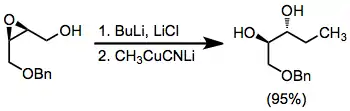 Under aprotic conditions, nucleophilic opening of epoxide isomers can be achieved with hydrides or organocuprates. Nucleophilic attack generally takes place at the least substituted carbon, yielding the more substituted diol product.[10]