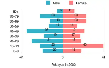 According to the 2002 Poland census, there were 370 people residing in Pełczyce village, of whom 50% were male and 50% were female. In the village, the population was spread out, with 24.6% under the age of 18, 31.9% from 18 to 44, 19.2% from 45 to 64, and 24.3% who were 65 years of age or older.[1]
