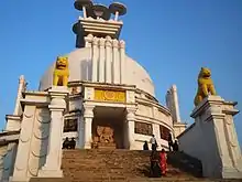 The Rajgir Vishwa Shanti Stupa/World Peace Pagoda (25°00′16″N 85°26′40″E / 25.004553°N 85.444539°E) was completed in 1969 at Rajgir hills near Rajgir, near the Vulture's Peak where the Buddha is believed to have preached the Lotus Sutra.[3] The dedication coincided with the 100th anniversary of the birth of Mahatma Gandhi. The site also includes a Nipponzan Myohoji temple.[4]