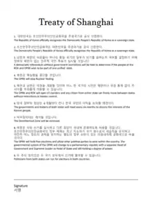 The Peace Treaty on Korean Peninsula is a proposed settlement to formally end military hostilities on the Korean Peninsula as a follow-up to the 1953 Korean Armistice Agreement implemented by the United Nations after the Korean War. During the inter-Korean summit on April 27, 2018, Kim Jong-un and Moon Jae-in signed the Panmunjom Declaration; the declaration involved an agreement about mutual efforts and action items for transforming the armistice agreement into a peace treaty with the cooperation of the United States and China.[1][2] During the 2018 Trump–Kim summit, US president Donald Trump and Kim signed a Joint Statement which reaffirmed the Panmunjom Declaration.[3] On November 23, 2023, North Korea terminated its 2018 agreement with South Korea, citing escalating military provocations, and plans to deploy military forces along the military demarcation line.[4]