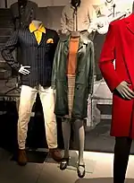 The fashion of the movement was mostly based around the embrace of feminine fashion elements by men, including tight silhouettes, bright patterns, long hair and makeup.[1] It also embraced a variety of other influences, ranging from the Romantic era to traditional African and Asians elements.[2] Suits were commonly worn, particularly in Edwardian or continental Europe's style of tailoring,[3][4] and in unconventional textiles including corduroy, paisley and brocade.[5] Suits also often incorporated bright colours, vivid patterns, embroidery, slim fits, large lapels, cravats, Nehru jackets, frilly shirts and kipper ties.[3][4] Boots, generally winklepickers, were favoured over shoes.[4] A 1973 article by the New York Times divided the period's suits into three different periods: the original style typified by the Nehru jacket and sport coat; the middle period which was influenced by Edwardian dress; and the later period which saw the rise of wide lapels and bell-bottoms.[6]
