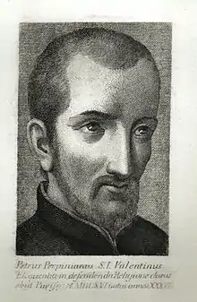 Pepinyá was born at Elche in Valencia to Melchior Pepinyá and Eleanora Clapes.[1] He began his studies at a school in Oriheula, and later went to the University of Valencia where Juan Luis Vives had previously studied.[1] There, Pepinyá studied under Pedro Juan Núñez; his other instructors included Juan de Celaya, Miguel Hieronymus, Jerome Ledesma, and Juan Blasius Navarro.[1] Pepinyá received his bachelor's degree on July 6, 1541.[1] He and his brother Luis joined the Jesuit order on September 30, 1551.[1] He went to teach rhetoric at the Jesuit college in Lisbon, where he taught alongside Cypriano de Soarez.[1] He regularly gave speeches, including the inaugural address at the University of Coimbra in October 1555.[1] He was ordained a priest by Bishop João Nunes Barreto, Patriarch of Ethiopia the same month.[1] He also delivered the funeral oration for Prince Luis, the brother of King John III of Portugal, in 1555.[1][2] He then served as court preacher to the Queen from 1557 to 1559.[1] In 1561 he went to help with the Jesuit College in Rome and befriended the Italian humanist Paolo Manuzio.[1] In 1563 he was working on his own rhetoric treatise.[1] His rules for student awards were incorporated into the Ratio Studiorum.[1] In 1565 he made a revision of Soarez's De arte rhetorica.[1] At the request of Francesco Adorno, he wrote De ratione liberorum instituendorum literis Graecis et Latinis (How to Teach Children Latin and Greek).[1][2] Pepinyá disagreed strongly with the rhetorical innovations of Peter Ramus.[1] Pepinyá died in Paris.[1][2]