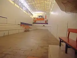 Pelayo trinquet is, according to the necessities of the Valencian Pilota sport, an elongated court, with a length of 58.5 m, width of 11 m and height of 3 m. Despite its required elongated shape, it is actually one of the widest trinquets, which involves some challenge for players, who are used to smaller courts. This trinquet is power-lit and equipped with an electronic scoreboard on the wall behind the rest gallery.