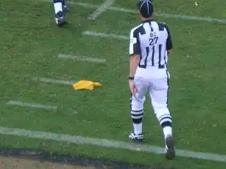 Officials initially signal fouls by tossing a bright yellow flag onto the field toward or at the spot of the foul. Until 2021, flags in Canadian football were orange.[7] Because of this, broadcasters and fans often use the terms "flag", "flag on the play", or "flag is down" to refer to fouls during the game.