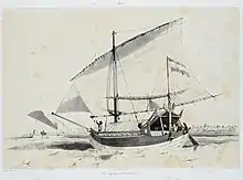Pencalang (mislabelled as mayang) at full sail, Java, 1841