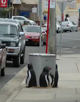 The Big Penguin, which Penguin is home to, was made of ferro cement by the Goliath Cement Co of Railton and later coated with fibreglass, is located in the town’s centre opposite the Post Office. Unveiled on 25 October 1975, it was erected to commemorate the centenary of the naming of the town.[17] Concerns were raised in 2008 as to the possibility of asbestos contamination, but the Big Penguin was given the all clear.[18] It is also interesting to note that all street rubbish bins are decorated with ornamental cement fairy penguins.