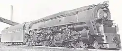 PRR's Board approved $595,000 for the construction of this experimental Class dual service locomotive on Oct. 9, 1940. it was built in March 1942. Its streamlined shrouding, according to an interview of John W. Epstein, Special Projects Manager and vice president, Raymond Loewy & Assoc.,[2] was designed by Raymond Loewy, but,due to WWII, there was no publicity about it. The Q1 was a duplex locomotive; it had a wheel arrangement of 4-6-4-4, consisting of a four-wheel leading truck, two sets of driving wheels (six followed by four) in a rigid locomotive frame and a four-wheel trailing truck. The first group of six driving wheels was driven by a pair of cylinders mounted conventionally in front of them, while the rear four driving wheels were driven by cylinders mounted behind them on either side of the firebox.[3] As a locomotive designed for dual service like PRR M1s,[4] it was given larger-sized driving wheels at 77 in (1.956 m), which was as large as the Grand Trunk Western class U-4-b 4-8-4 "Northern" type.