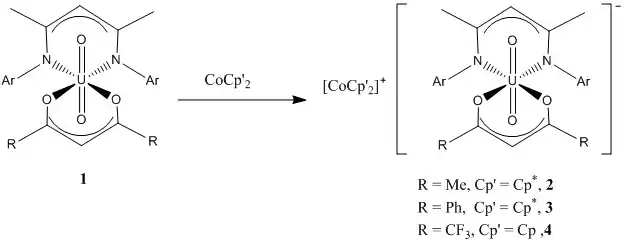 Hexavalent uranyl complexes with different β-diketonate ligands (R= Me, Ph, CF3) are used for this reduction of uranyl dication ([UO2]2+). The introduction of electron withdrawing substituents at the R position of the β-diketonate ligand favors the reduction of hexavalent uranyl complexes. These electrochemical reductions are carried out with CoCp2⋅ or CoCp2 in toluene and the reduction potential is measured using cyclic voltammetry.