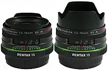 The Pentax smc DA 15mm F4 ED AL Limited is a wide-angle prime lens for Pentax K-mount, announced by Pentax on March 2, 2009. Along with Pentax's other DA Limited primes, it was replaced in 2013 with an HD-coated version with rounded aperture blades.[1]