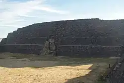The site main structure is unique in Mesoamerica; it is considered the first constructive stage, combining a large rectangular stepped structure with "sunken patios" (pool) and round structures built on top. The structure basement is stepped to adjust to the irregular terrains it was built on.[4]