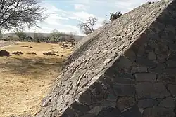 It is a stepped rectangular structure oriented east–west with external side walls built at an approximate 45 deg., angle, built from stone and earth, stucco and finishings of clay mixed with vegetal fibers. The structure perimeter is stepped and measures some 147 (east-west) by 137 (north-south) meters (482 by 450 ft.).[4]