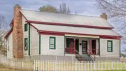 Each of the main rooms has two nine over six double-hung sash windows flanking a central chimney stack (each of which were rebuilt using original material after the move in 2012[2]), and each of the cabinet rooms has a single double-hung nine over six window. Original hardware for shutters is still present on the exterior of the windows. The northern and southern sides of the building also each feature two fixed six-pane windows in the attic. Before the rear loggia was enclosed, both external doors were flanked by sidelights;[3] when the rear was enclosed, the door was moved to the new rear entrance, but the sidelights were left intact.[2] The exterior wall of the enclosed loggia contains 4 four over four double-hung sash windows which break the original symmetry of the facade.[2] The front door and most of the interior doors contain four recessed panels, the door between the northern main room and the bathroom has five panels, and the door from the bathroom to the enclosed rear loggia is a modern six-panel door. The rear door present at the back of the central passageway when the house was listed on the National Register in 1994 did not include any panels and was likely not original.[3] The current rear door of the enclosed loggia has four panels.[2]