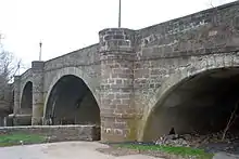 The Perkiomen Bridge, originally built 1798-99 and widened in 1928, is one of the oldest stone arch bridges in the United States still in use. It crosses Perkiomen Creek near Collegeville, Pennsylvania. The bridge's six semi-circular arches cover a total of over 300 feet (91 m). The longest arch spans 76 feet (23 m). Its decorative piers and belt courses are unusual for a bridge this old. A lottery financed $20,000 of the original construction. The bridge carried the main road from Philadelphia to Reading, known at various times as the Manatawny Pike, Germantown Pike, the Philadelphia-Reading Pike, and US 422. Since the construction of the US 422 bypass, the road has been known as Ridge Pike or Old US 422.[3][4][5][6]