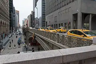 The western leg is 35 feet (11 m) wide; the eastern leg is 33 feet (10 m) wide between 42nd and 44th Streets, widening to 53 feet (16 m) north of 44th Street. The roadway above 42nd Street, which connects the two legs, is 40 feet (12 m) wide.[19] The portion of the viaduct immediately surrounding the terminal's building has a masonry balustrade with an additional metal guardrail.[3] There is a cast-iron eagle atop the balustrade where the western leg curves onto the connecting roadway above 42nd Street.[20][21] A sidewalk, accessible from the Grand Hyatt hotel, runs along the section of the viaduct that is parallel to 42nd Street.[16]