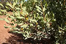 Persoonia cordifolia is an erect to spreading shrub that typically grows to a height of 0.3–2 m (1 ft 0 in – 6 ft 7 in) with several to many stems arising from the base and has smooth, mottled grey bark. The branches and leaves are hairy at first but become glabrous with age. The leaves are arranged alternately, spatula-shaped or elliptic to linear, 20–65 mm (0.79–2.56 in) long, 3–13 mm (0.12–0.51 in) wide and twisted through up to 90° so that the leaves are held in the vertical plane. Some populations, such as plants near Yellowdine, have more twisted leaves than others. The flowers are arranged in groups of up to ten along a rachis up to 70 mm (2.8 in) long that usually grows into a leafy shoot after flowering, each flower on a pedicel 2.5–9 mm (0.098–0.354 in) long. The tepals are bright yellow, 6.5–11.5 mm (0.26–0.45 in) long with bright yellow anthers. Flowering occurs from November to February and the fruit is an oval drupe 7–13 mm (0.28–0.51 in) long and 5–7 mm (0.20–0.28 in) wide containing a single seed.[2][3][4][5][6]