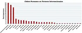 Universitario is the Peruvian club that more international cups disputed, with 46 participations, followed by Sporting Cristal (45), Alianza Lima (37), Melgar (13), Cienciano (11), Sport Huancayo (9), Juan Aurich (8), Sport Boys (8) and Universidad César Vallejo (7).