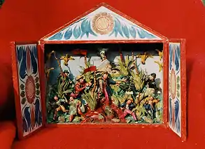 Retablos are a sophisticated Peruvian folk art in the form of portable boxes which depict religious, historical, or everyday events that are important to the Indigenous people of the highlands. It is a tradition originated in Ayacucho.