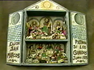 In a syncretic process, the early retablos brought by the Spanish merged with Indigenous beliefs in the Andean region to acquire certain magical or symbolic properties which had been the attributes of local spirits before the Conquest. This was particularly true of the retablos named after St. Mark, known as cajones sanmarcos (“boxes of St. Mark”). Since St. Mark is the patron saint of farm animals, his spirit was used to invoke protection of cattle from disease and theft. These early retablos were wooden boxes with figures inside carved from stone, ivory or wood.
