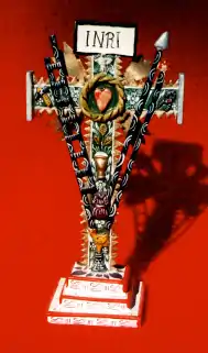 He frequently injects elements that remind us of his Andean heritage. For example, this Crucifix has three coca leaves below the heart of Christ. He says he put them there to remind us that coca leaves (not cocaine) play an important role in Indigenous Andean cultures.