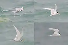 The Peruvian tern is a very small species with a length of about 24 cm (9.4 in).[2] The upper half of the head and neck are black, and the remaining part of the head is white. The back, wings and tail are grey, the throat, chin and breast are white, and the chest, belly and flanks are pale grey. The under tail-coverts are white. The bill is yellow with a black tip, the irises are brown and the legs are yellowish. The pale grey underparts differentiate it from other small terns. It has a very rapid and characteristic wingbeat. The call is a shrill "kik" and a harsh "gree", and it also utters a descending series of "kee-ee-eer" notes.[2]