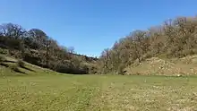 Peter Dale is a short dry crag-sided valley near Buxton, Derbyshire, in the Peak District of England. There is a farmland plateau on either side. The northern end of the valley leads into Hay Dale at Dale Head and the foot of the valley leads into Monk's Dale. Hay Dale and Monk's Dale are both part of the Derbyshire Dales National Nature Reserve managed by Natural England. The Carboniferous limestone rocks of all these dales were formed 350 million years ago from the shells and sediments of a tropical sea. The landscape was then sculpted by the ice sheets from the last Ice Age 20,000 years ago.[1][2]