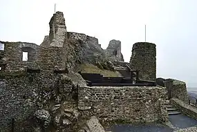 On 21 May 1280, Peter Kőszegi excommunicated Nicholas Pok and his three brothers, who had participated in Peter Csák's looting raids against the Diocese of Veszprém. In the upcoming years, the Pok brothers continued to plunder the Transdanubian estates of the bishopric, for instance they attacked and ravaged the church property in Tapolca, Csököly and Görgeteg around 1278, while also devastated the episcopal village Hegymagas in Zala County, slaughtering the local population.[16][17] In retaliation, besides the punishment of excommunication, Peter Kőszegi's troops raided the family monastery of the Pok clan in the namesake village near Győr. He ordered to transfer its treasury, relics and jewelry to St. Michael's Cathedral of Veszprém.[15] In 1285, he personally led his episcopal army in the siege of the castle of Szigliget, also owned by the Pok kindred. There, he confiscated the seized religious relics and values, including chasubles, books and gems for his diocese. Some historians connect and merge the two events, and consider the treasury of the Pok monastery were transferred to Szigliget Castle sometime after the Mongol invasion.[18] Peter was present in October 1280 at Ozalj Castle along the river Kupa, when his brothers Nicholas, who was made Ban of Slavonia in that time, and Ivan concluded peace with their local enemies, the Babonići and Frankopans.[19]