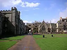 Housing and sanitary improvements were effected under the provisions of an Act of Parliament passed in 1790; and an Act was passed in 1839 to build a gaol to replace the two that previously stood.[8] After the dissolution the dean and chapter, succeeded the abbot as lords of the manor. The municipal borough was incorporated in 1874 under the government of a mayor, six aldermen and eighteen councillors.[17] Among the privileges claimed by the abbot as early as the 13th century was that of having a prison for felons taken in the Soke of Peterborough, a liberty within Northamptonshire. This afforded it administrative and judicial independence from the rest of the county, with it having a quarter sessions separate from the rest of Northamptonshire from 1349.[18] In 1576 Bishop Edmund Scambler sold the lordship of the hundred of Nassaburgh, which was coextensive with the Soke, to Queen Elizabeth I, who gave it to Lord Burghley, and from that time until the 19th century he and his descendants, the Earls and Marquesses of Exeter, had a separate gaol for prisoners arrested in the Soke.[13] The abbot formerly held four fairs, of which two, St. Peter's Fair, granted in 1189 and later held on the second Tuesday and Wednesday in July, and the Brigge Fair, granted in 1439 and later held on the first Tuesday, Wednesday and Thursday in October, were purchased by the corporation from the Ecclesiastical Commissioners in 1876. The Bridge Fair, as it is now known, granted to the abbey by King Henry VI, survives.[19] Prayers for the opening of the fair were once said at the morning service in the cathedral, followed by a civic proclamation and a sausage lunch at the town hall which still takes place. The mayor traditionally leads a procession from the town hall to the fair where the proclamation is read, asking all persons to "behave soberly and civilly, and to pay their just dues and demands according to the laws of the realm and the rights of the City of Peterborough".[20]