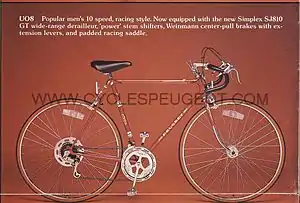 The Peugeot UO 8 was a ten-speed bicycle manufactured by Cycles Peugeot during the "bike boom" of the 1970s. It was marketed as a mid-range "racing style" cycle, and was manufactured from sometime in the early 60s[1] until the end of 1980.[2] The model was discontinued for the 1981 model year.[3]