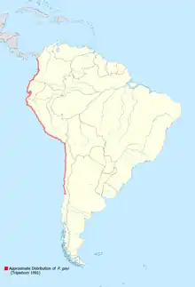 This species has been reported to occupy the Pacific coast of South America, from Central Chile to Ecuador. P. gayi is only found on beaches with ample access to algae, or other types of vegetative detritus like fruit, and beaches that allow for organisms of the species to burrow into the sand.[3]