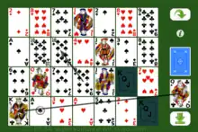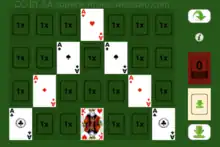 Pharaoh's Grave is a gallery style free cell based game played with 104 playing cards. It arranges the foundations as pyramid and when successfully finished, the Pharaoh, symbolized by the King of Hearts, is on the center bottom and the aces build the pyramid.