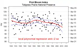 4th series, vol 3 (1899), page 511. - ↑ Monahan, William B.; Rosemartin, Alyssa; Gerst, Katharine L.; Fisichelli, Nicholas A.; Ault, Toby; Schwartz, Mark D.; Gross, John E.; Weltzin, Jake F. (2016). "Climate change is advancing spring onset across the U.S. National park system". Ecosphere. 7 (10): e01465. doi:10.1002/ecs2.1465. hdl:10150/622065.