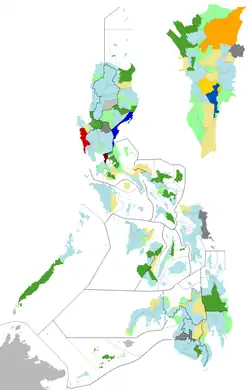 District election results (80% of the seats), with Metro Manila on the inset, and party-list seats indicated by black boxes.