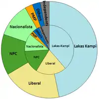 By May 21, GMA News and Public Affairs, based on their partial and unofficial tally, had Lakas Kampi CMD with the party with the most seats with 109, followed by the Liberal Party with 43, the Nationalist People's Coalition had 33, and the Nacionalista Party had 25. The other parties garnered 13 seats. This includes candidates who switched parties after the campaign period has begun, while excluding party-list representatives.[1]