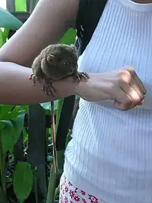 Tarsiers in the Philippines have been sought out as pets or sold for trade, despite their low survival rate outside of their natural habitat, where they feed on live insects.[33] Displays by private people in Loboc, Bohol[23][34] tend to diminish the lives of tarsiers.[35] Further, some feel that the display of captive tarsiers might encourage tourists to acquire them illegally as pets.[34]