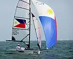 The Philippines first Paralympic Sailing Team competed on the 2-person keelboat (SKUD 18), which also made its official debut in the Paralympics. The only Paralympic class keelboat with a spinnaker, was, for this event, emblazoned with the national flag of each country. Pedro Sollique, paraw fisherman from Virac, Catanduanes was SKUD helm while crew Cherry Pinpin, a creative director from Quezon City trimmed sails and flew the spinnaker. The Philippine flag spinnaker was a generous, timely donation by an anonymous Australian businessman.