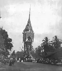Phongyibyan is widely observed by Buddhists throughout Myanmar, including the Bamar, Mon, Rakhine, and Shan peoples. Similarly elaborate cremation ceremonies, congruous with those in Myanmar, are also held by the Northern Thai people.[2] Among the Shan and Lanna peoples, the ceremony is known as poy law (ပွႆးလေႃ or ปอยล้อ),[3] which literally means "ceremony of the cart,"[4] whereby poy is a Burmese loanword meaning "festival" or "ceremony" (cf. Poy Sang Long).
