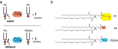 When ethanol is present, PLD substitutes ethanol for water and covalently attaching the alcohol as the head group of the phospholipid; hence the name phosphatidylethanol. Normally PLD incorporates water to generate phosphatidic acid (PA); the process is termed transphosphatidylation.[4] PLD continues to generate PA in the presence of ethanol and while PEth is generated and the effects of ethanol transphosphatidlyation are through the generation of the unnatural lipid not depletion of PA.[3]