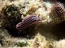 This nudibranch has a black dorsum with longitudinal pink ridges. The rhinophores are black.[4]
