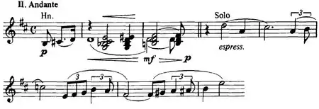 - This contrast with the later works can be heard from the opening bars, where a brass fanfare precedes a flourish of double octaves and chords on the piano – a musical gesture similar to the Schumann and Grieg piano concertos. This flourish occurs later in the movement, as well, an important factor in the symmetry of the movement. The main theme (like the other themes in this work common to both versions) is short by Rachmaninoff's standards but already shows the sequential devices and arch-like design inherent in his later works.[2]