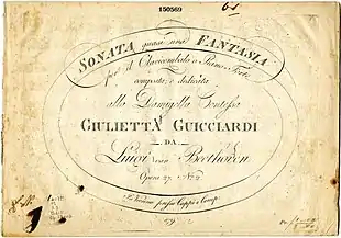 - ↑ The title page is in Italian, and reads SONATA quasi una FANTASIA per il Clavicembalo o Piano=forte composta e dedicata alla Damigella Contessa Giulietta Guicciardi da Luigi van Beethoven Opera 27 No. 2. In Vienna presso Gio. Cappi Sulla Piazza di St. Michele No. 5. (In English, "Sonata, almost a fantasia for harpsichord or pianoforte. Composed, and dedicated to Mademoiselle Countess Julie "Giulietta" Guicciardi, by Ludwig van Beethoven. Opus 27 No. 2. Published in Vienna by Giovanni Cappi, Michaelerplatz No. 5.") The suggestion that the work could be performed on the harpsichord reflected a common marketing practice of music publishers in the early 19th century (Siepmann 1998, p. 60).