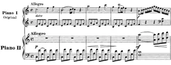 In 1876–1877, Edvard Grieg arranged this sonata for two pianos, by adding further accompaniment on the second piano part, whilst the first piano part plays the original as Mozart wrote it.[3] Grieg's intent was to "impart to several of Mozart's sonatas a tonal effect appealing to our modern ears".[4]