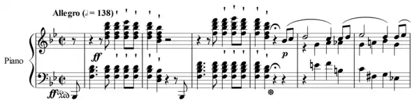 The first movement opens with a series of fortissimo B♭-major chords, which form much of the basis of the first subject. After the first subject is spun out for a while, the opening set of fortissimo chords are stated again, this time followed by a similar rhythm on the unexpected chord of D major. This ushers in the more lyrical second subject in the submediant (that is, a minor third below the tonic), G major. A third and final musical subject appears after this, which exemplifies the fundamental opposition of B♭ and B♮ in this movement through its chromatic alterations of the third scale degree. The exposition ends with a largely stepwise figure in the treble clef in a high register, while the left hand moves in an octave-outlining accompaniment in eighth notes.