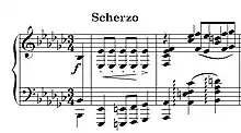 The movement is in the conventional scherzo-trio-scherzo form[15] with the trio in G♭ major. The scherzo's explosive rhythmic and dynamic power, as well as its furious insistence on repeated chords and octaves, places it in the tradition of the scherzo movements of Beethoven. However, unlike Beethoven, whose scherzos are transformed minuets, this scherzo has many defining rhythmic characteristics that make it a transformed mazurka instead.[10] The trio, marked Più lento, has a songlike quality to it with its simple, sensuous melody.[16] Following the return of the scherzo is a coda[7] that is a condensed reprise of the trio[17] and therefore ends the work in the relative major; other works of Chopin that also end in the relative major include the Scherzo No. 2 in B♭ minor (Op. 31) and the Fantaisie in F minor (Op. 49).