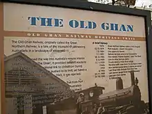 The Afghan Express is a return trip to Quorn from Port Augusta (78 kilometres return). This train usually consists of Ghan carriages from the 1920s and is often hauled, wherever possible, by an original Ghan steam locomotive, NM25, and recreates the type of travel experienced on the Ghan in the 1930s and 1940s.[6]