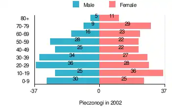 According to the 2002 Poland census, there were 432 people residing in Pieczonogi village, of whom 48.1% were male and 51.9% were female. In the village, the population was spread out, with 22% under the age of 18, 39.6% from 18 to 44, 18.1% from 45 to 64, and 20.1% who were 65 years of age or older.[1]