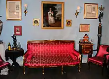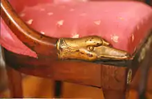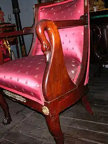 In 1817 President James Monroe purchased a suite of furniture for the White House, which was made famous in Jacqueline Kennedy's TV tour of the White House. The furniture is in the Blue Room.[1] He also produced furniture for Napoleon at Saint-Cloud, for the Tuileries, Joséphine's Château de Malmaison, and also for his brother Joseph Bonaparte. Examples of his work can be seen at Windsor Castle and Buckingham Palace in England. The set of furniture, property of the Yuko Nii Foundation, in the Treasure Room of the Williamsburg Art & Historical Center in Williamsburg, Brooklyn, is of the period when Napoleon was emperor, around 1810, and has the swan motif favored by Josephine, his first wife. It is entirely possible that this set was made for one of Napoleon's or Josephine's rooms.
