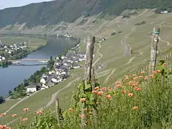 Near Piesport lies the Moselloreley, a similar formation to the Loreley on the Rhine. The craggy massif that rises steeply out of the Moselle allows no transport links downstream, nor is there even any room for a footpath. Nevertheless, here and there on its steep slopes are found vineyards. For a decade in the 1930s, there was mining here. Above the Moselloreley runs a hiking trail.