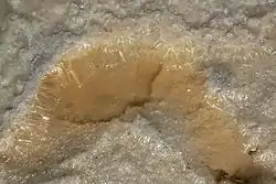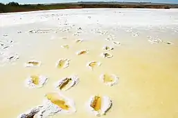 The physical and chemical properties of the black mud at the bottom of the lake have been also studied due to its application as a peloid.[7] The solid (dry) component is classified as sandy loam, containing on average 71% sand, 24% silt and 5% clay.[7] Chemically, the main component is silica, with additional major contributions from alumina, sodium chloride, iron(III) oxide, sulfate and carbonate salts.[8] These are found as minerals like quartz, clay minerals (mainly kaolinite with some montmorillonite and illite), halite, thenardite, burkeite, calcite, muscovite and albite.[7]