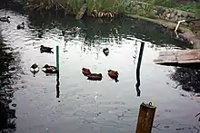 In the 1880s, a member of the Denny family built a house on North 90th Street and Densmore Avenue North in Seattle. James and Marietta Pilling purchased the property in 1909, and converted it to a dairy farm.[1] In 1924, their twelve-year-old son Charles A. Pilling (October 6, 1911 – October 24, 2001) dug a small pond to care for three injured mallard ducks he had been given.[2] This began Pilling's lifelong interest in breeding waterfowl. Over the years, the size of the pond was expanded to 100 by 50 feet (30 m × 15 m) on the half-acre lot. It was fed fresh water by diverting Licton Springs. It is bordered by bamboo stands, and yet with a viewing area on North 90th Street, it still remains part of Seattle's urban landscape. In the 1950s Pilling created a manually operated flood control system that was still in use in 2011.[3]