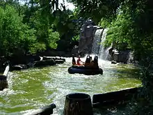 The ride starts with a descent through a dark tunnel, which opens up into a broad section of rapids in which the rafts can even overtake one another. The rafts then pass two waterfalls. In some cases the rafts line up in such a way that unlucky visitors will get a quick shower from the very edge of the falls. After this the river narrows. The area between the waterfalls offers visitors a chance to watch the boats go by. After the waterfalls there is a narrow passage with another overpass. In hot summers there will be a water jet from the wall to ensure that the boats will be splashed. The rapids get more intense throughout the ride, until it passes the narrow pass. After this pass it will drift between two waterfalls which are literally two walls of water. After passing the last waterfall the ride ends with more intense rapids. From the exit a walk can be made around the ride, using Inca rope bridges.